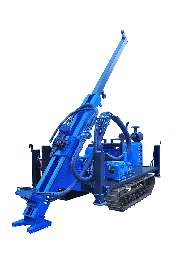 無線遙控行走,液壓桅桿自動升起,動力頭自動移機提鉆為該鉆機一大特色,其中桅桿自動升起,動力頭移機極大緩解了現場施工的難度,有效減小了鉆機施工人數,節(jié)約成本,該鉆機采用78KW發(fā)動機,動力強勁,扭矩大,適用于各類復雜地層的金屬礦開采